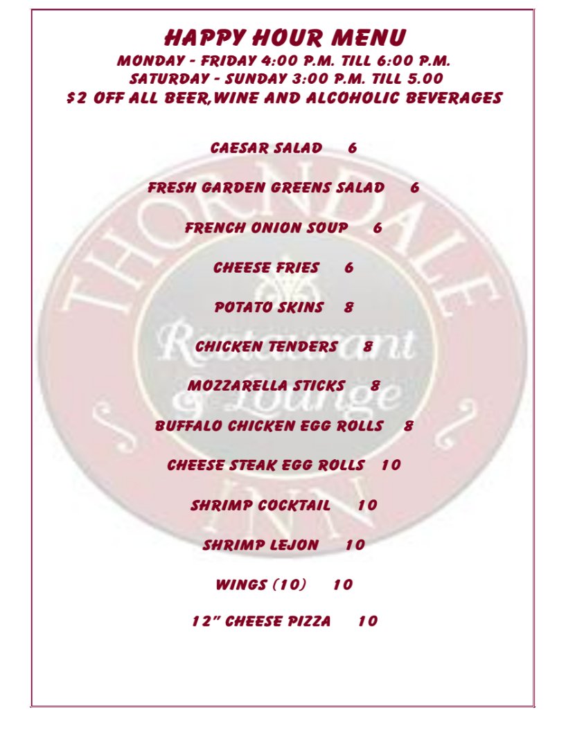 Bar Hours: Monday - Thursday 3:00 to 11:00 PM